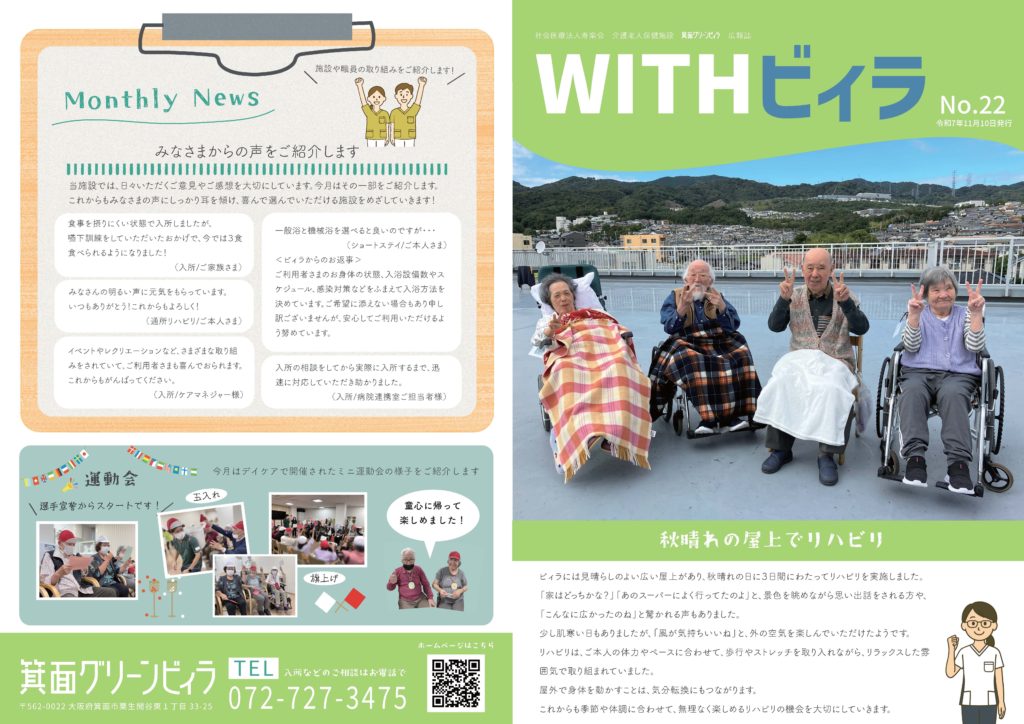 箕面グリーンビィラ広報誌『WITH ビィラ』の名前には、当施設がご利用者さまやご家族さまにとって、心地よい生活と人々とのつながりを「ともに」育む場所でありたいという思いが込められています。
